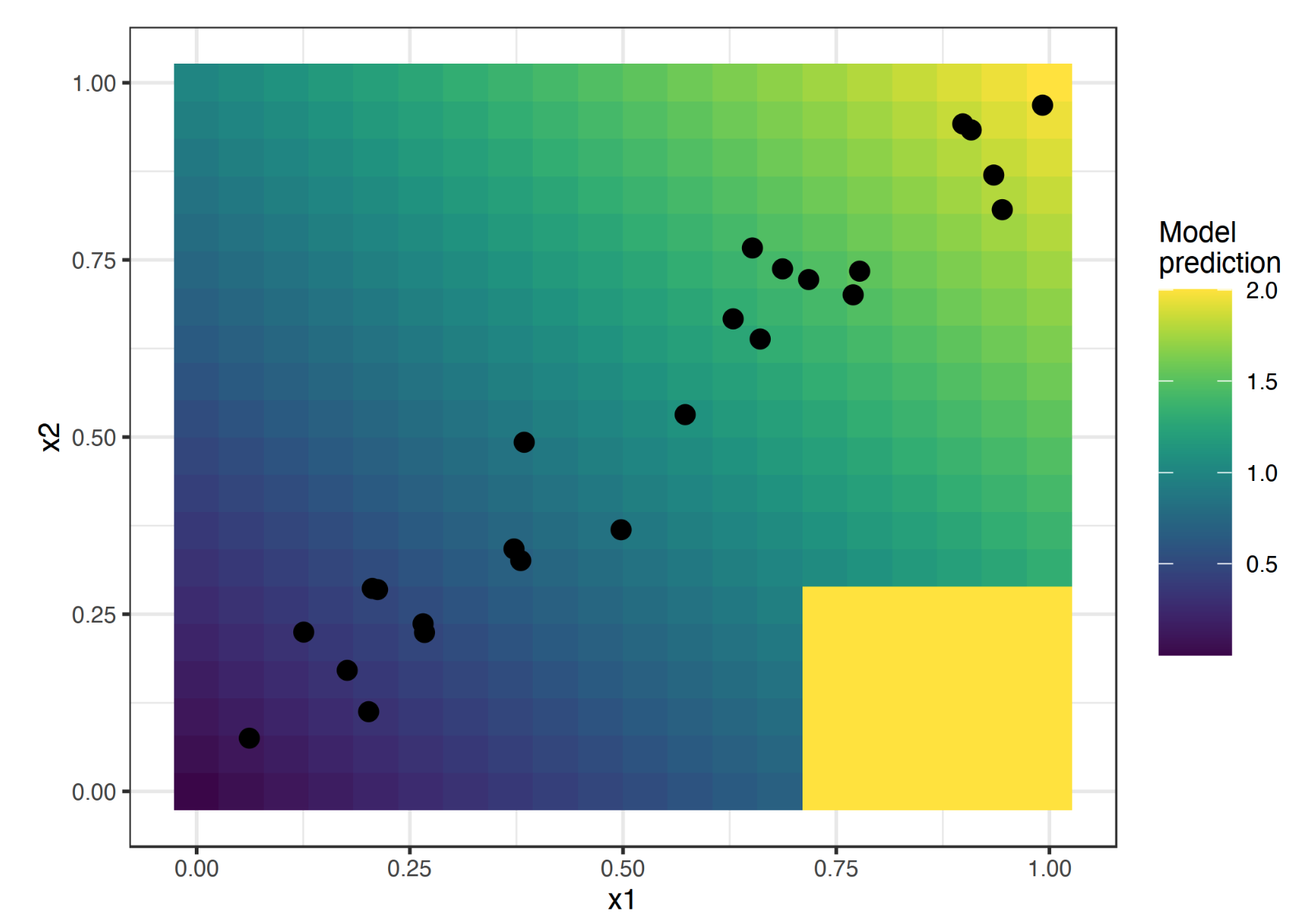 当描述两个特征时,ALE描述特征2在特征1的基础上,对预测值的影响,下图为例,用 $(f(d) - f(c)) - (f(b) - f(a))$ 作为特征 2 在特征 1 的基础上对预测值的影响。