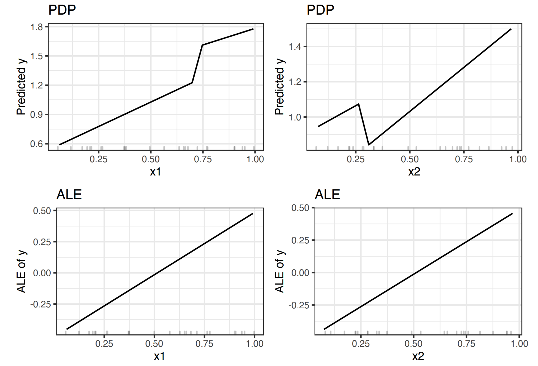 案例1:右下角的极端情况,会出现 PDP 获取了实际中不存在的样本,而 ALE 展示的效果就很好